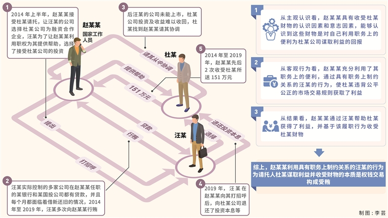 首先,從主觀認(rèn)識(shí)看,請(qǐng)托人杜某看中的是趙某某手中的職權(quán)能為其公司謀取利益;就汪某而言,其之所以愿意違反公平原則為杜某謀取利益,實(shí)際是懾于趙某某的職權(quán),為的是自己的貸款審批能在趙某某處獲得通過(guò);就受賄人趙某某而言,其主觀上具有收受杜某財(cái)物的認(rèn)識(shí)因素和意志因素,能夠認(rèn)識(shí)到這些財(cái)物是對(duì)自己利用職務(wù)上的便利為杜某公司謀取利益的回報(bào)。其次,從客觀行為看,趙某某充分利用了其職務(wù)上的便利,通過(guò)具有職務(wù)上制約關(guān)系的汪某的行為,使杜某違背公平公正的市場(chǎng)交易規(guī)則獲取了利益。最后,從結(jié)果看,趙某某通過(guò)汪某幫助杜某獲得了利益,并基于該履職行為收受杜某財(cái)物。綜上,趙某某利用具有職務(wù)上制約關(guān)系的汪某的行為為請(qǐng)托人杜某謀取利益并收受財(cái)物的本質(zhì)是權(quán)錢(qián)交易,構(gòu)成受賄。